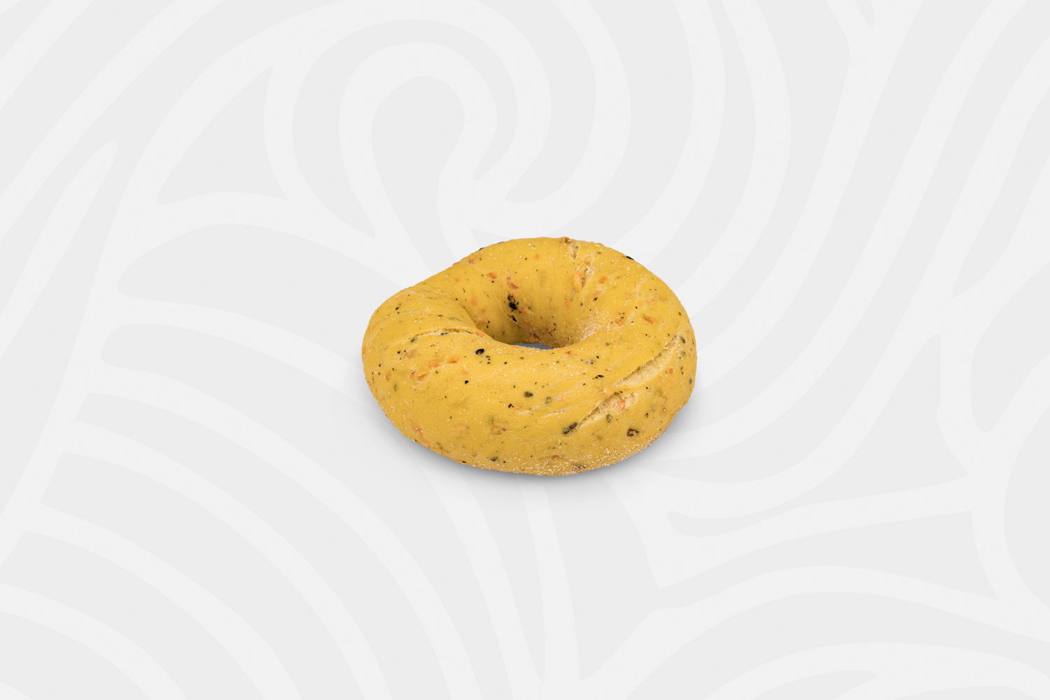 Een frisse lichtzoete bagel. Deze bagel bevat de heerlijke smaken van zoete aardappel en oranje peen. Om deze zoete combinatie een tegenhanger te geven in frisheid is gember verwerkt.